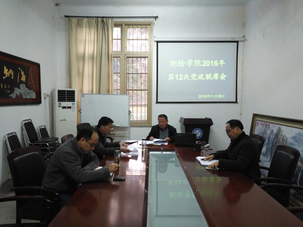 11月28日下午,测绘学院党委在102会议室召开党政联席会,推进“管党治党宽松软问题”专项治理工作。测绘学院全体党政领导出席会议,会议由测绘学院党委副书记吴军(主持工作)主持。