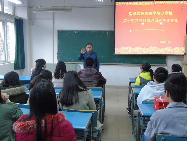 12月1日下午,医学院、外国语学院分党校第十期发展对象培训班毕业典礼在西区医教106教室举行。外国语学院党委书记、院长石秀光在典礼上致辞,医学院党委副书记张可佳出席典礼。