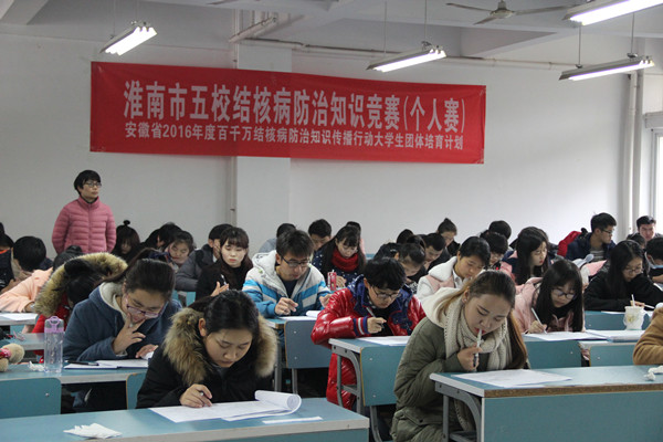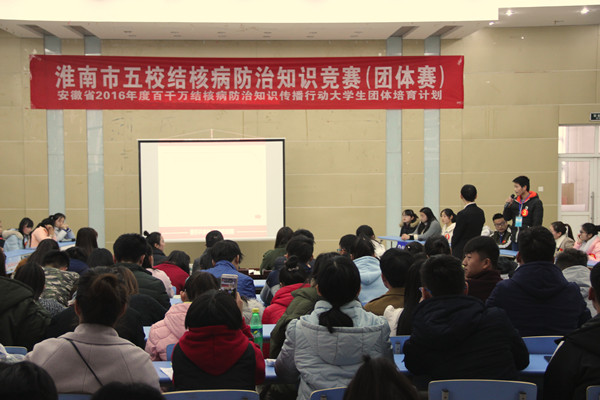 12月3日,淮南市五校结核病防治知识竞赛在我校西校区顺利举行。来自安徽理工大学、淮南师范学院、淮南联合大学、淮南职业技术学院和安徽工贸职业技术学院的150名同学参加了比赛。