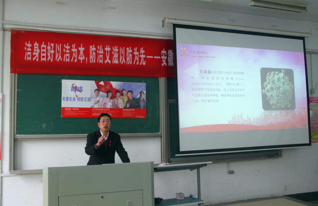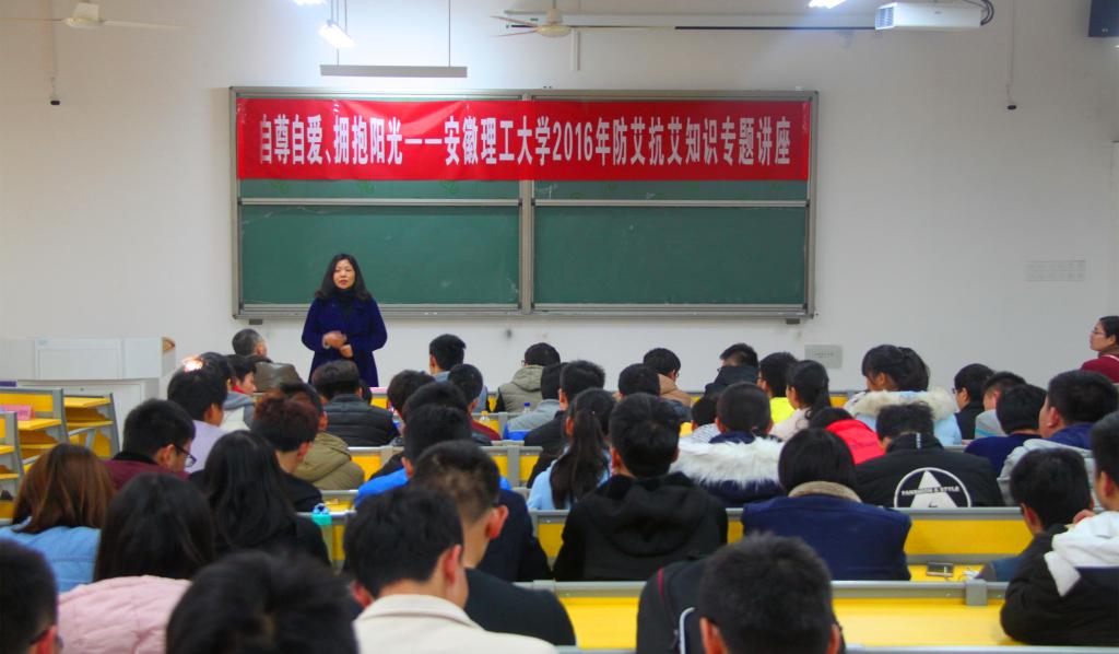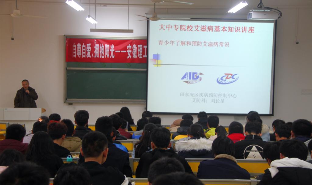 为在大学生中普及艾滋病防控知识,学生处联合淮南市田家庵区疾病与预防控制中心和市第一人民医院、市传染病院,分别举办两次防艾抗艾知识专题讲座。12月8日下午,在新校区天工南112教室举办了“自尊自爱、拥抱阳光”防艾抗艾知识专题讲座。12月12日下午,在北区北实405教室举办了一场“洁身自好以洁为本,防治艾滋以防为先”防艾抗艾知识专题讲座。
