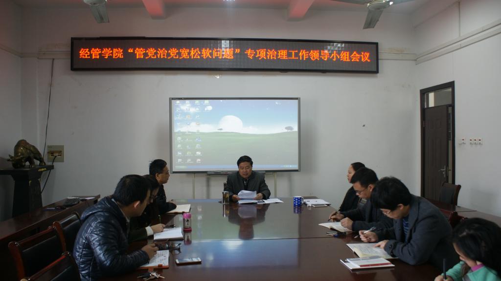 12月9日上午,经管学院召开“管党治党宽松软问题”专项治理工作小组会议,学习贯彻校党委印发的《“管党治党宽松软问题”专项治理工作六个治理方案》,推进学院专项治理工作。学院党委书记李梁主持会议,学院专项治理工作小组成员参加会议。
