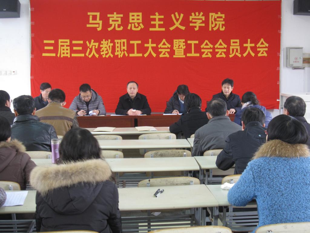 12月23日上午,马克思主义学院三届三次教职工大会暨工会会员大会在庄严的国歌声中隆重开幕。校党委书记郭永存,校工会主席李广田、副主席李颖应邀出席大会。马克思主义学院全体教职工和工会会员参加大会。会议由副院长孙功主持。