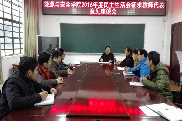 1月6日下午,能源与安全学院在学院214会议室组织召开了民主生活会征求意见座谈会,广泛听取教师代表的意见和建议。学院党委书记欧阳连勤主持座谈会。党代会代表、田区人大代表、党支部书记、科级干部、辅导员、教师代表参加了座谈会。