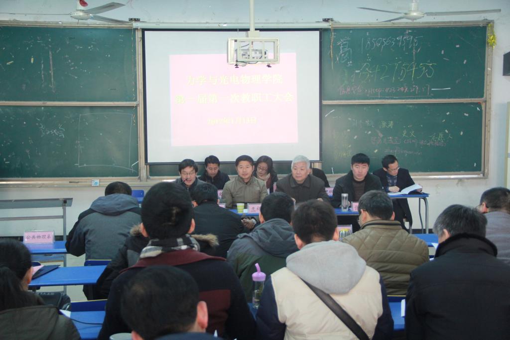 1月13日,力物学院第一届第一次教职工大会在原理学院报告厅隆重召开,这是学院教职工政治生活中的一件大事,也是广大教职员工参与学院民主管理,共谋学院改革与发展大计的一次盛会。副校长孟祥瑞教授应邀出席大会并讲话。