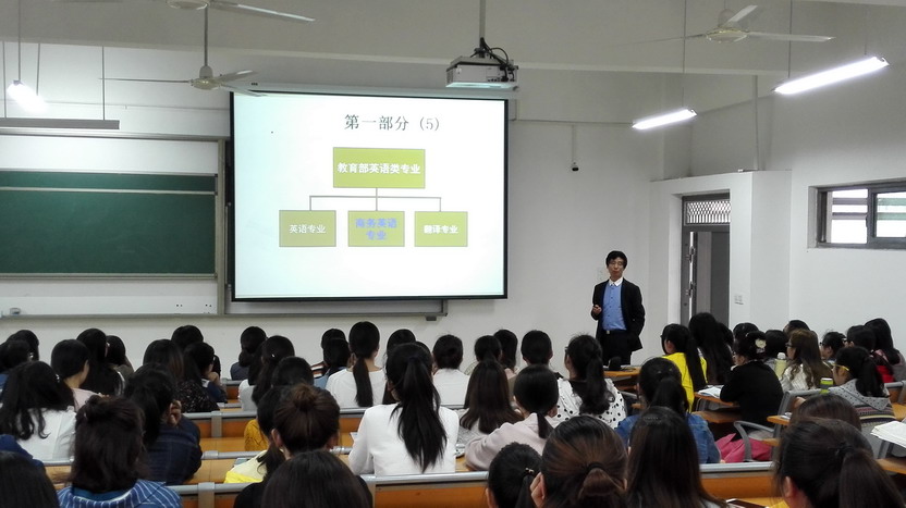 翁凤翔从“竞争与生存:英语专业学生的未来”谈起,简要介绍了商务英语发展的社会历史文化背景、商务英语课程学习与职业发展素质、商务英语本科专业设置在全球经济一体化和现代国际商务中的重要意义及竞争优势,重点阐述了国际商务英语人才培养的模式、途径与现实意义。他认为,优秀的国际商务英语从业人员,不仅要具备扎实的英语语言功底和较强英语应用能力,还应具备基本的经济学(特别是国际贸易、国际金融等)、管理学、国际商法、计算机、跨文化交流等方面的知识和能力。他还回答了有关外语专业就业、考研、未来职业发展等同学们普遍关注问题。