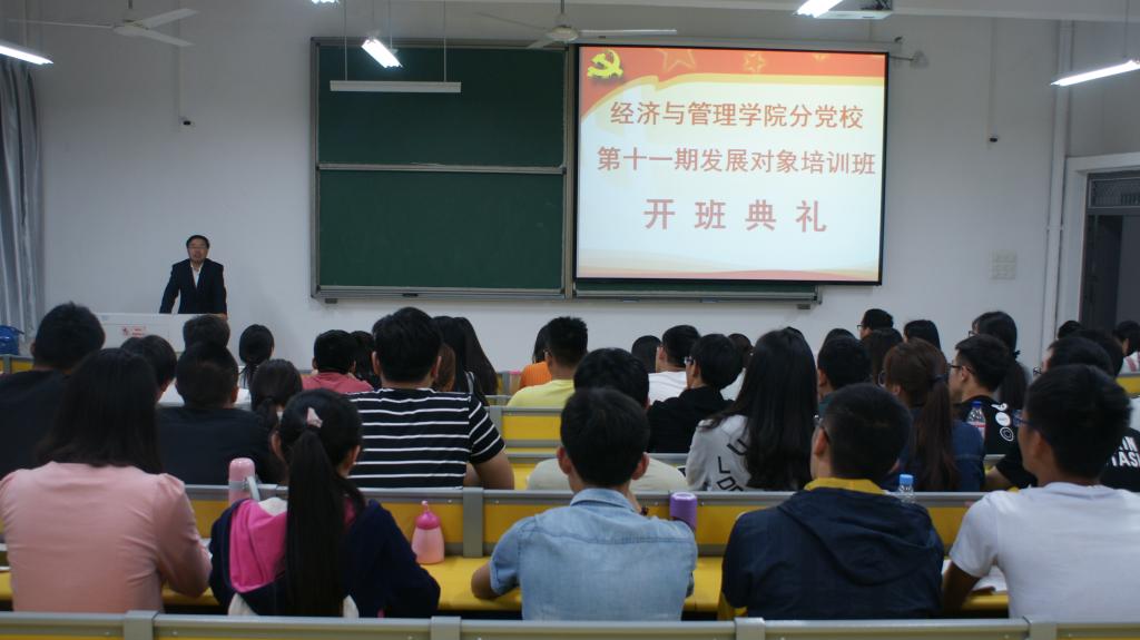 4月24日晚上,经济与管理学院分党校第十一期发展对象培训班开班典礼在明理北302教室隆重举行。院党委书记、分党校校长李梁出席开班典礼并讲话。开班典礼由学院党委副书记马蓓蕾主持,学生党支部书记和培训班全体学员参加了典礼。