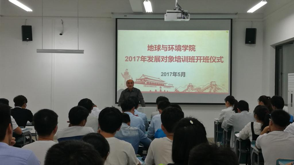 5月5日晚,地球与环境学院在院202教室举行2017年党员发展对象培训班开班仪式。学院党委书记、分党校校长盛鹏飞出席仪式并讲话,各年级辅导员和发展对象80余人参加仪式。院党委副书记侯辉主持开班仪式。