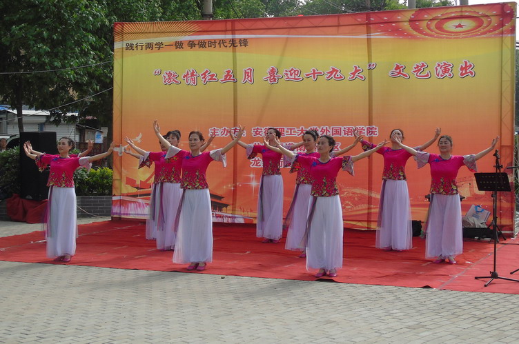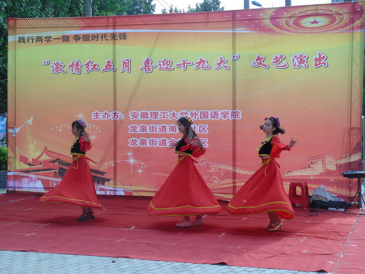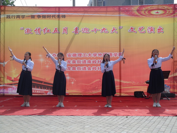 5月5日下午,外国语学院党员师生走进田家庵区龙泉街道南岭社区,与社区的文艺爱好者们一起登台,为社区居民送上主题为“激情红五月,喜迎十九大”的文化大餐,以实际行动迎接党的十九大召开。