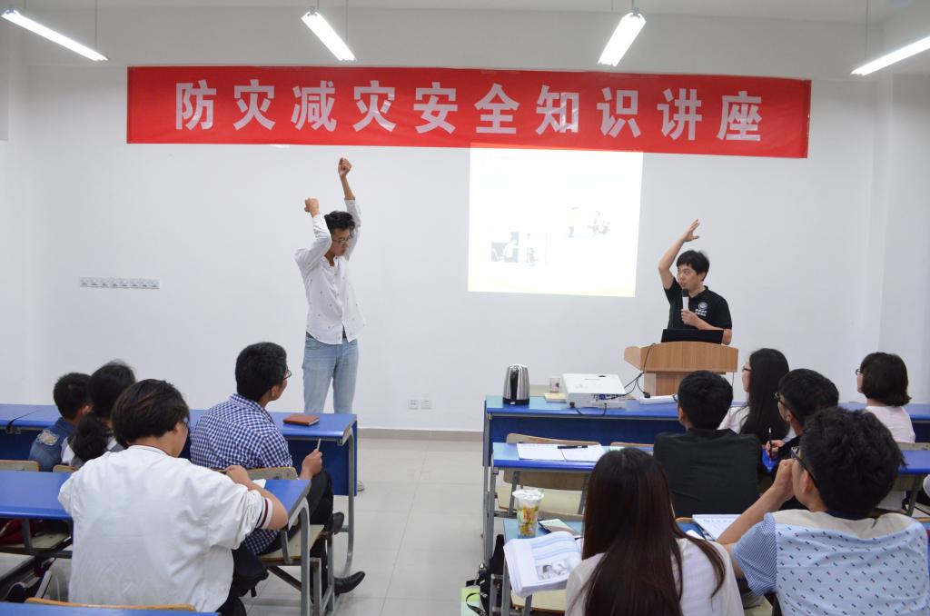 朱亮从近年来发生的地震统计资料介绍入手,讲解了地震的产生、我国的地震带分布情况,分析了我省的地震史及我市防范地震的部署情况。朱亮结合实际案例详细讲解了防灾减灾的基本知识及地震来临时应如何自救与互救等专业知识,并现场演示逃生姿势,教授同学如何正确避险。讲座氛围热烈,现场互动良好,参加讲座的土木工程16-6班的张浩翔同学表示,讲座不仅增强了自己的防灾减灾意识,同时也让自己进一步掌握了在地震等灾害来临时基本逃生防范技能。