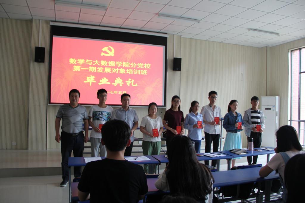 5月14日下午,数大学院分党校在学院报告厅隆重举行第一期发展对象培训班毕业典礼。数大学院党委副书记(主持工作)、分党校校长赵前进,院党委副书记、分党校副校长李勇,辅导员及培训合格的学员参加了毕业典礼。毕业典礼由李勇主持。
