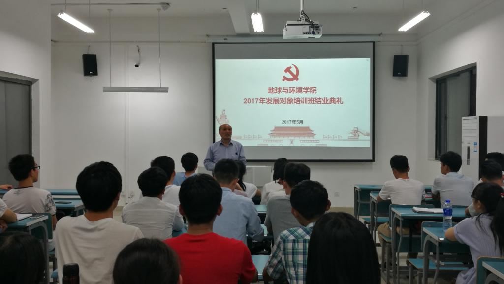 5月19日晚,地球与环境学院在院202教室举行2017年发展对象培训班结业典礼。学院党委书记、分党校校长盛鹏飞出席仪式并讲话。各年级辅导员和发展对象80余人参加仪式。院党委副书记侯辉主持结业典礼。
