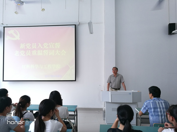 6月8日下午,材料科学与工程学院在学院楼B111教室举办毕业生党员重温入党誓词大会。校特邀党建组织员、原电气与信息工程学院党委书记胡光厚为党员上党课。材料学院党委副书记范洪喜主持会议。2017届全体毕业生党员参加了本次大会。