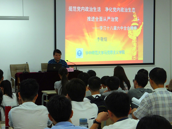 6月15日上午,应科技产业处和电气与信息工程学院邀请,华中师范大学教授、博士生导师、湖北省党建研究中心副主任、湖北师范大学“彩虹学者”李敬煊来校讲学,在励行楼B112教室为师生党员和入党积极分子作了题为《规范党内政治生活、净化党内政治生态、推进全面从严治党》的学习十八届六中全会精神辅导报告。电气与信息工程学院全体辅导员以及学生党员、入党积极分子等120余人聆听了报告。报告会由学院党委副书记徐关怀主持。