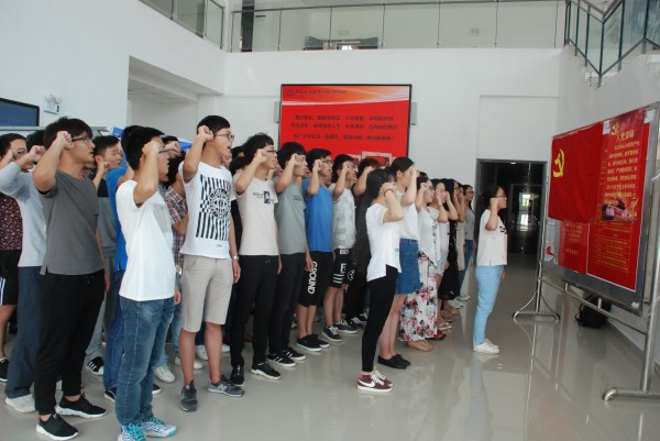 6月20日下午,机械工程学院2017届毕业生党员在励学楼一楼大厅重温入党誓词。学院党委副书记徐育军、毕业班辅导员和全体2017届毕业生党员参加。