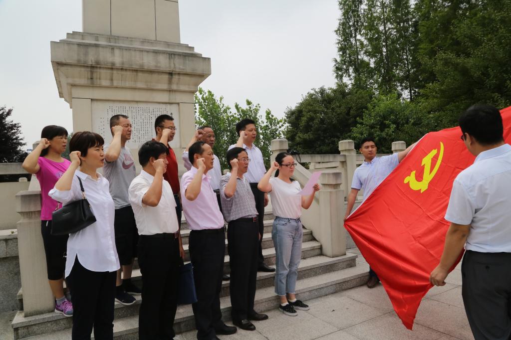 在寿县革命烈士纪念碑前,全体党员面对鲜红的党旗,重温了入党誓词。庄严而洪亮的宣誓声使每一位党员再一次接受心灵的洗礼,进一步坚定了理想信念。