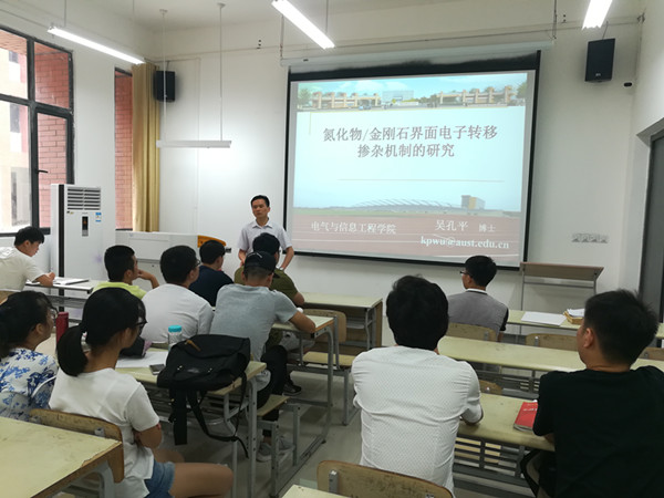 吴孔平自2016年6月前往日本访学,在访学期间刻苦钻研,圆满完成访学任务并于今年6月份返校。会上,吴孔平汇报了在日本访学一年里的工作生活情况和体会,介绍了在日本国立物质材料科学研究所(NIMS)开展第三代半导体材料与器件研究的过程和取得成绩,并作了题为《氮化物/金刚石界面电子转移掺杂机制的研究》专题报告,详细介绍了利用界面电子转移解决掺杂的方法。