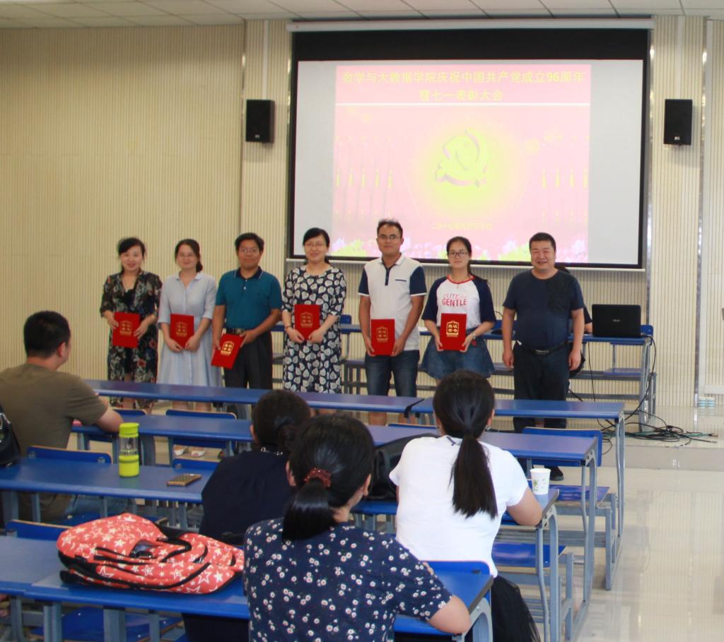 会议在雄壮的国歌声中拉开帷幕。赵前进宣读了《数学与大数据学院关于表彰优秀共产党员的决定》及《数学与大数据学院关于表彰庆祝建党96周年主题征文活动获奖作品的通知》。6名优秀共产党员、8名征文获奖党员受到了表彰。赵前进、李勇分别为获奖党员颁发了荣誉证书。