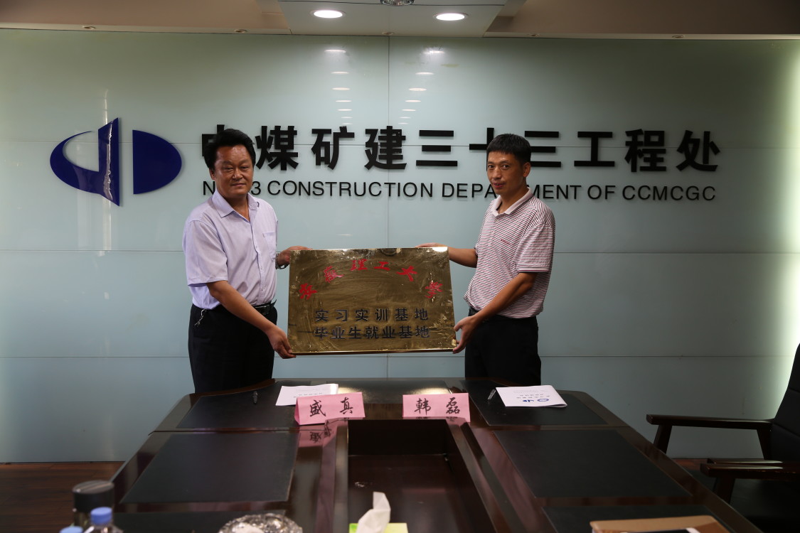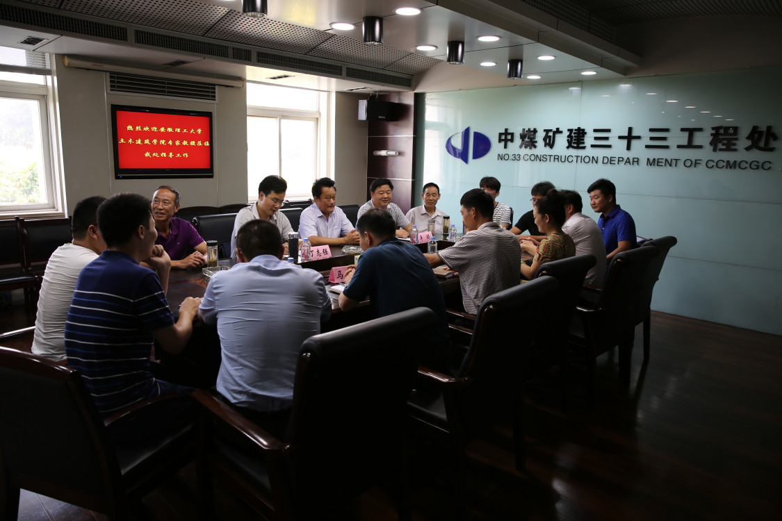 近日,土木建筑学院党委书记盛真等一行4人赴宿州市中煤矿建三十三工程处洽谈校企合作事宜。三十三工程处党委书记韩磊,党委副书记、纪委书记、工会主席马雪松等热情接待了盛真一行。