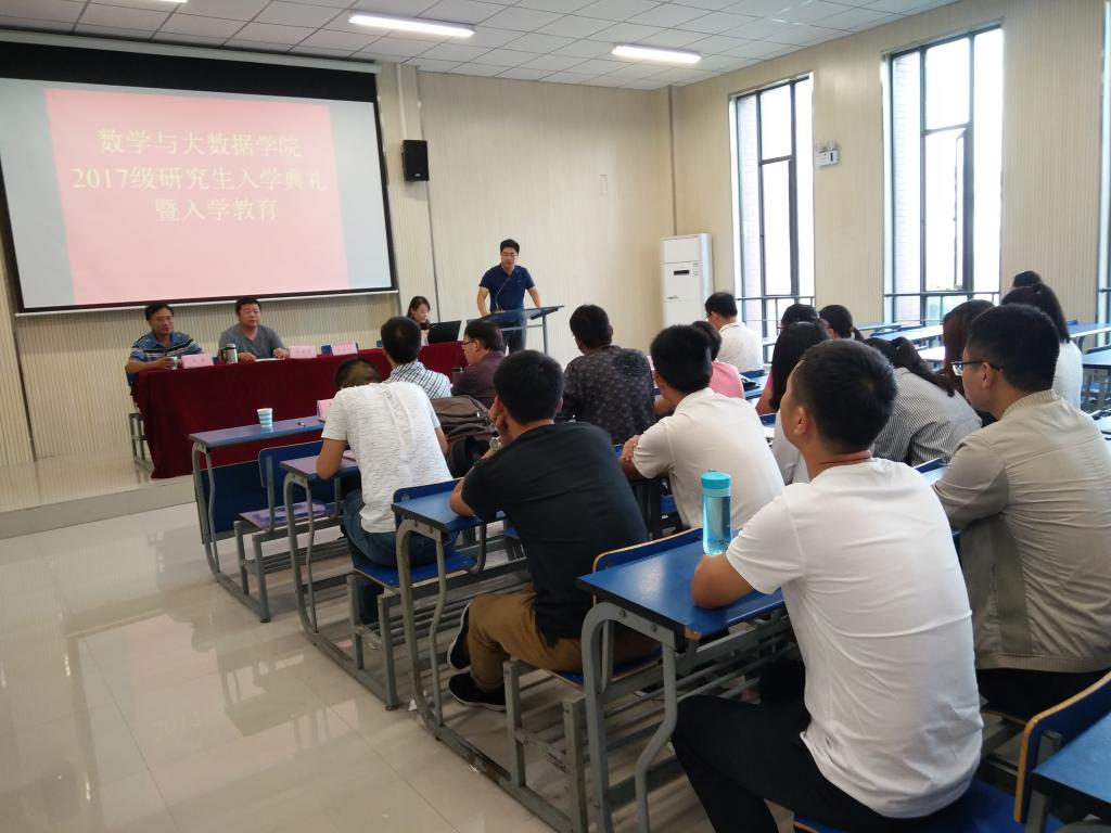 9月9日上午,数学与大数据学院在学院楼一楼学术报告厅举行2017级硕士研究生新生开学典礼暨入学教育开班仪式。院党委书记赵前进、院长方贤文、院党委副书记(兼副院长)李勇,各系主任、导师代表以及2017级硕士研究生新生参加了典礼。