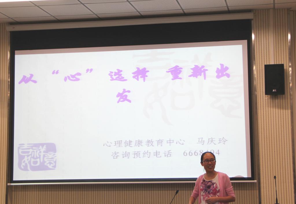 马庆玲老师结合自身实际,与同学们分享了自己关于心理健康教育的心路历程。同时她对2017级学生提出了建议,希望同学们可以拥有良好的心态,培养良好的品质;处理好与同学的关系;学会宽容合作;努力学习,不要为了谈恋爱、玩游戏、兼职而耽误自己的学业;多多锻炼自己,为了今后自身更好地发展而努力;希望每个大学生都可以过得充实而美满。