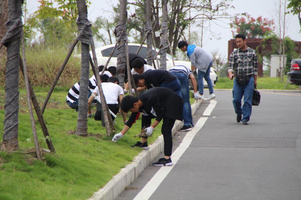 师生清理绿化带垃圾(摄影:学生记者提供)