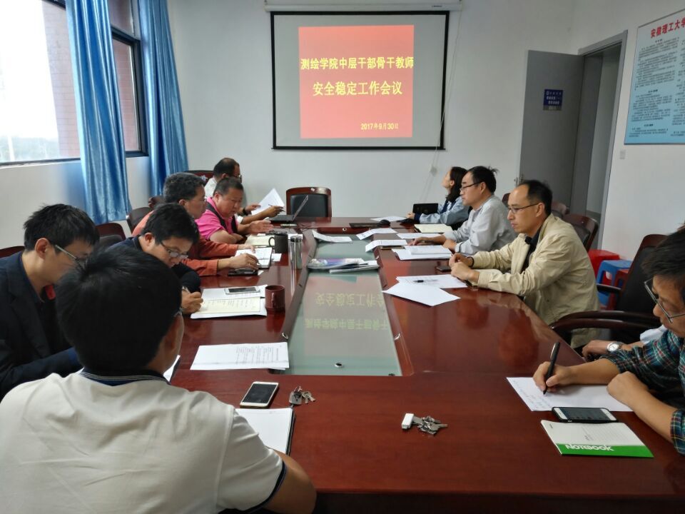 9月30日下午,测绘学院在南511会议室召开会议传达学校安全稳定工作会议精神。学院党政领导、各系负责人、教工党支部书记、科级干部、辅导员参加了会议。会议由院长赵志根主持。