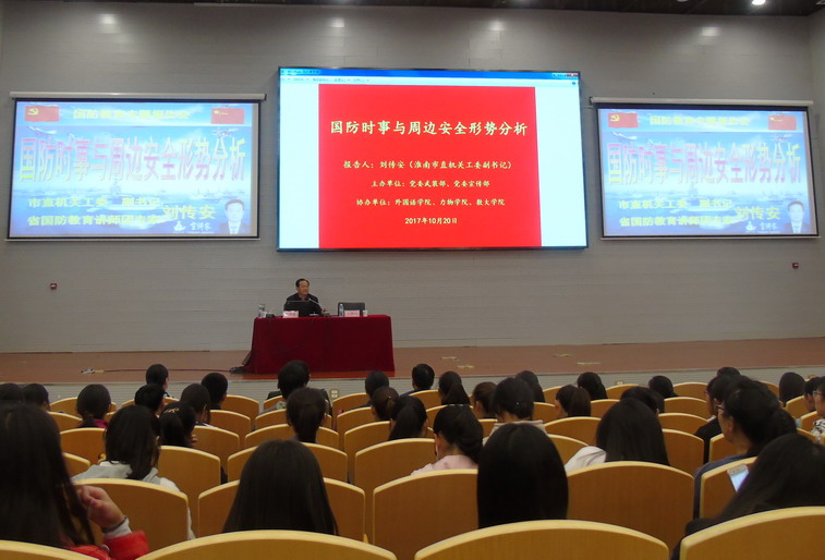 为普及国防教育,培养当代大学生国防意识,增强大学生履行国防义务自觉性,提升民族凝聚力和向心力,10月20日下午,校党委武装部、党委宣传部联合邀请省国防教育讲师团成员、淮南市直机关工委副书记刘传安在舜耕会堂举办国防形势教育报告会。外国语学院、力学与光电物理学院、数学与大数据学院共500余名师生聆听了报告。