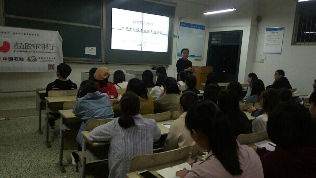 10月20日,人文学院社会工作专业2016级同学参加了淮南师范学院姚政宏老师关于“失独老人志愿服务项目”志愿者培训讲座,为后期即将开展的失独老人志愿服务工作做准备。