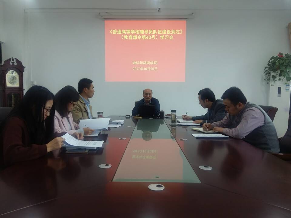 10月25日下午,地球与环境学院在院406会议室召开学习贯彻《普通高等学校辅导员队伍建设规定》(教育部43号令)学习会。学院党委书记盛鹏飞主持学习会。院党委副书记侯辉及全体辅导员参加会议。