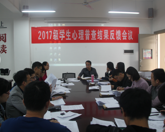 10月26日下午,2017级学生心理普查结果反馈会在学生处会议室召开。学生处副处长涂有胜主持会议。心理健康教育中心专职教师以及各学院新生辅导员参加了会议。
