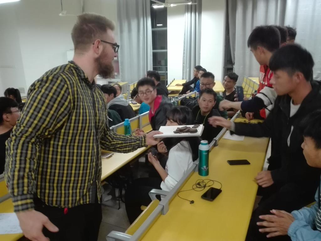 Björn Eike Marx和Jannis Killian Marx向同学们介绍了德国的饮食、起居和生活习惯,以及他们在中国学习和生活期间的感受,比较了中德文化的差异。交流环节,同学们逐一用英语发言,并进行自我介绍。Marx兄弟向同学们分发了德式面包、巧克力和糖果。