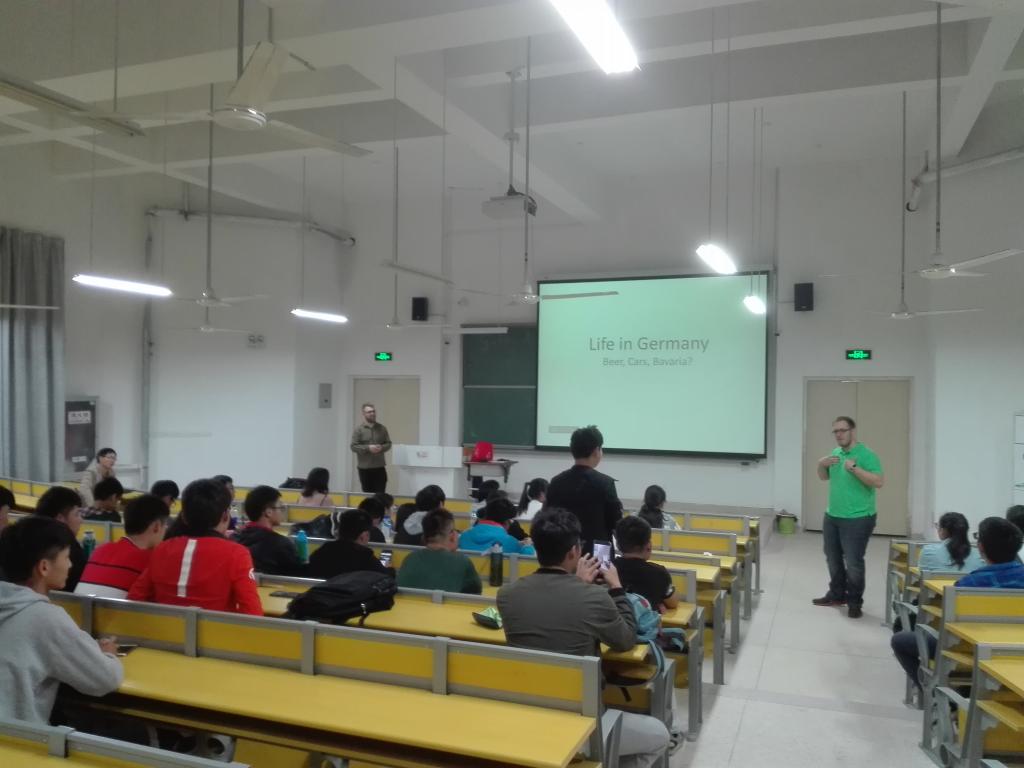 10月27日晚,测绘学院在明理303教室举办了面向2017级本科生的中德学生交流会——“与德国Marx兄弟对话”。正在测绘学院进行短期交流学习的Björn Eike Marx和Jannis Killian Marx与学院2017级同学进行了充分友好的交流。