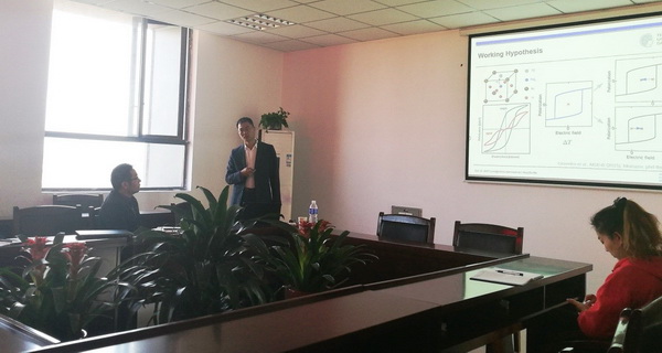 在材料学院,马杨斌博士作了题为《Electrocaloric Effect of Ferroelectrics and Relaxors》的学术报告。 报告中马杨斌向在座师生详细讲述了利用蒙特卡罗对铁电到顺电相变过程中的场致温度变化和非遍历过程进行模拟,建立了铁电体和弛豫铁电体的电热效应转化模型。报告会现场,相关专业的老师和学生与马杨斌博士进行了深入讨论与交流。材料学院、力学与光电物理学院相关教师以及材料学院硕士、博士研究生等40余人参加本次报告会。报告会后,马杨斌博士参观了材料学院部分相关实验室。
