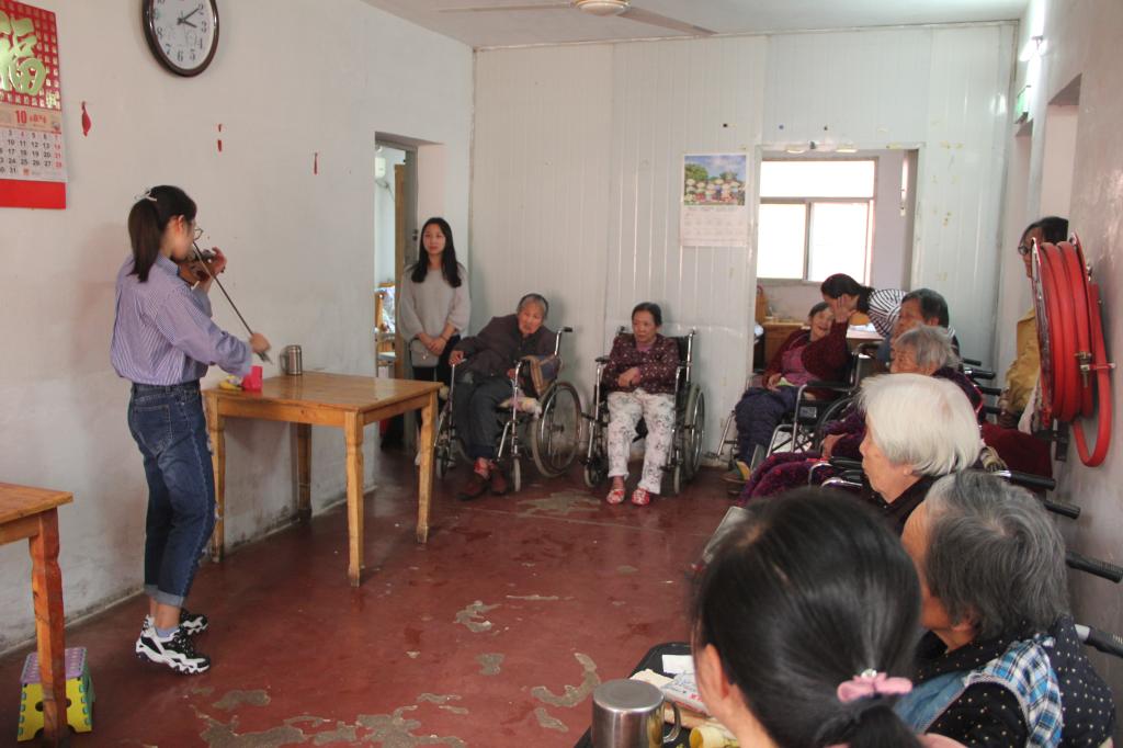 桃园居老年公寓的负责人向党员们介绍了敬老院的基本情况。随后,36名党员被分成四个小组,前往不同的房间慰问,给老人们送去水果和糕点,陪老人聊天,听老人讲自己过去的故事,与老人分享自己的校园生活,还为老人们带来了小提琴演奏、黄梅戏和歌曲小联唱等精彩节目,敬老院处处充满了欢声笑语。