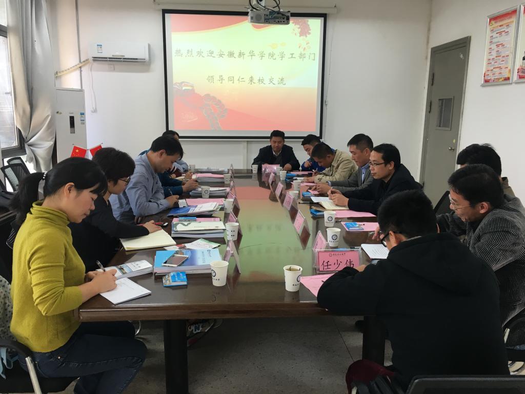 11月2日下午,安徽新华学院学生处处长、校团委书记汪俊东、财会与金融学院院长助理窦梅朋等一行6人,在我校厚德馆4楼学生处会议室,就学生教育管理服务工作,与我校学工部门工作人员进行交流研讨。党委学工部副部长、学生处副处长涂有胜主持会议。