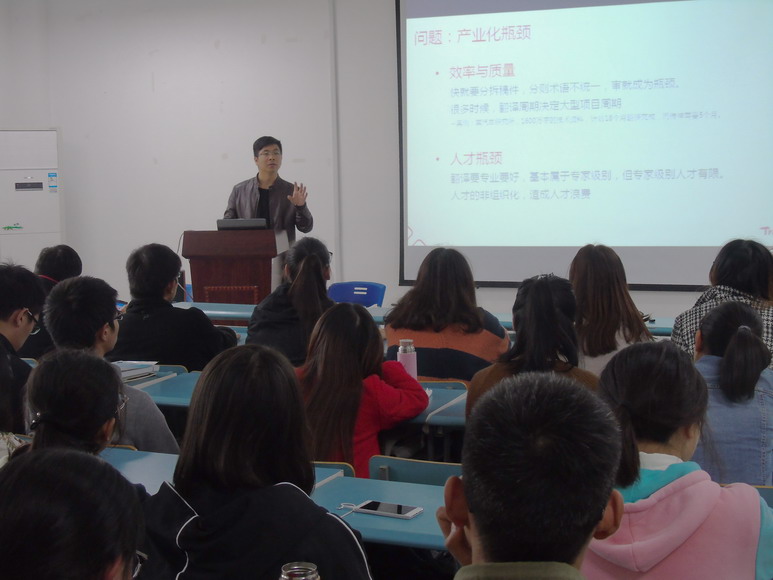 11月10日下午,应校科技产业处和外国语学院的邀请,武汉传神语联网网络科技股份有限公司高校部张华总经理在崇智楼B235教室作了题为《翻译行业的发展及展望》研究报告。报告会由外国语学院副院长王宗华主持。学院50多位学生聆听了报告。