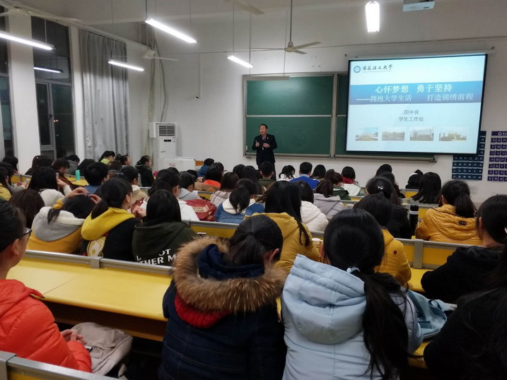 11月23日晚,外国语学院邀请校学生工作处处长田中良在明理北106教室为2017级新生作了题为《心怀梦想,勇于坚持》的讲座。讲座由学院党委副书记程秀霞主持。150名2017级本科生认真聆听了讲座。
