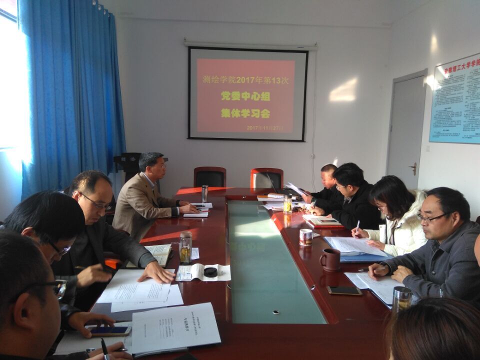 11月27日上午,测绘学院在学院楼南511召开党委理论学习中心组学习会,传达学校《中共安徽理工大学委员会关于认真学习宣传贯彻党的十九大精神的实施方案》文件精神,推进学院十九大精神学习工作。会议由院党委书记吴军主持。