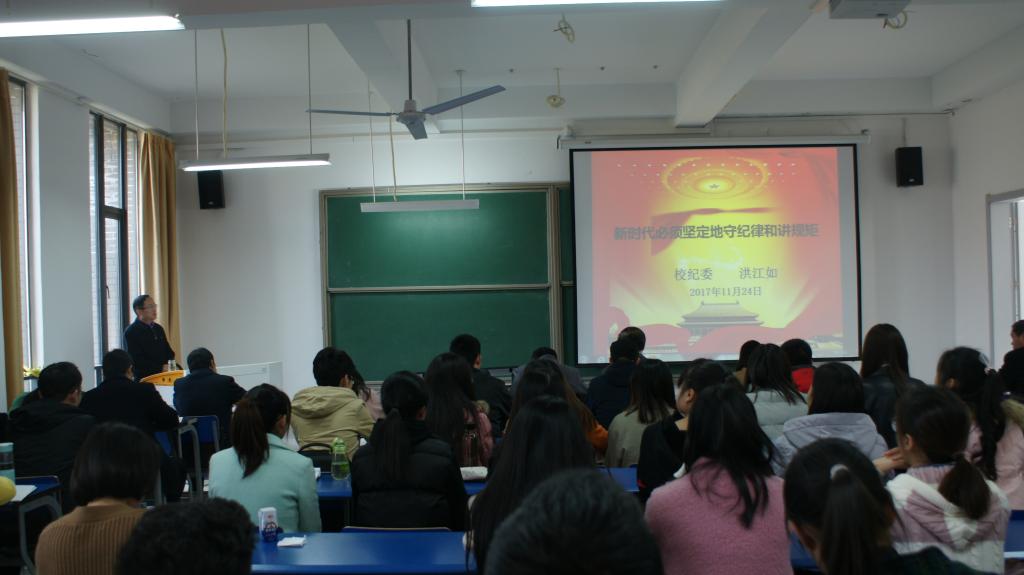 11月24日下午,根据学院2017年度党员培训班计划,经济与管理学院党委在崇信楼东104室举行专题报告会,邀请校纪委副书记洪江如作了题为《新时代必须坚定地守纪律和讲规矩》的专题报告。学院党委书记李梁主持报告会,学院党员师生聆听了报告。