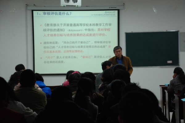 院长王传礼围绕本科教学工作审核评估目的、内容、标准等方面,对审核评估范围中的“6+1”审核项目、24个审核要素、64个审核要点等内容进行了深入分析和解释,明确了学院、教师、学生的主要任务。