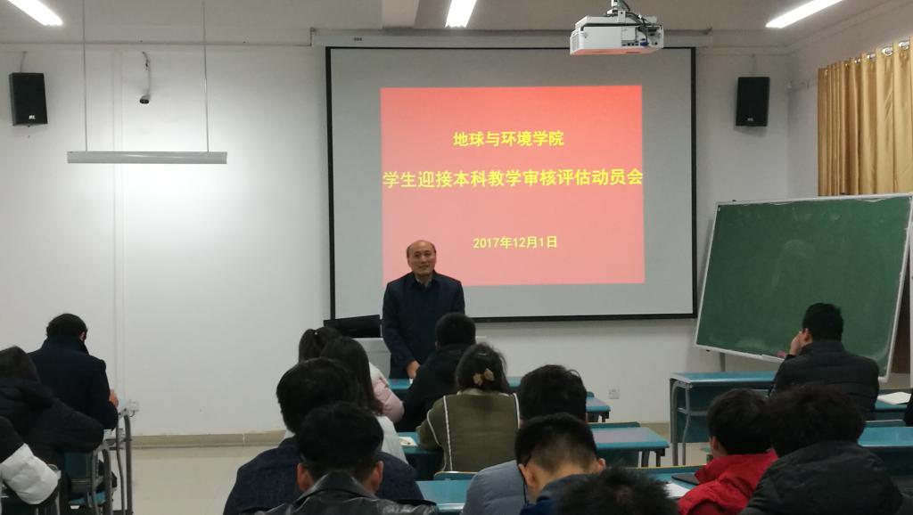 12月1日晚,地球与环境学院在静远楼202教室召开学生迎接本科教学工作审核评估动员会,院党委书记盛鹏飞出席会议并讲话,各年级辅导员、主要班级干部80多人参加会议。院党委副书记侯辉主持会议。