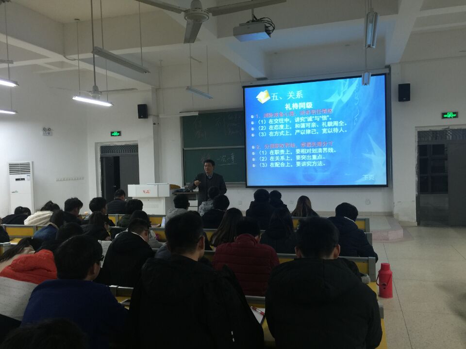 为了提升大学生社交礼仪水平和就业能力,营造迎接本科教学审核评估的和谐校园氛围,11月30日晚,化工学院在明理楼101教室举办了社交礼仪专题讲座,邀请校毕业生就业工作处处长谢振安主讲。全院200余名师生听取了讲座。讲座由学院党委副书记徐泽绵主持。