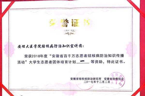 12月3日,安徽省百千万志愿者结核病防治知识传播行动大学生志愿团体培育计划评审结果揭晓,我校医学院结核病防治宣讲团申报的《“以文化之名,促健康校园”公益活动计划》(项目指导老师:尤佳锋)以总分第一获立项支持。