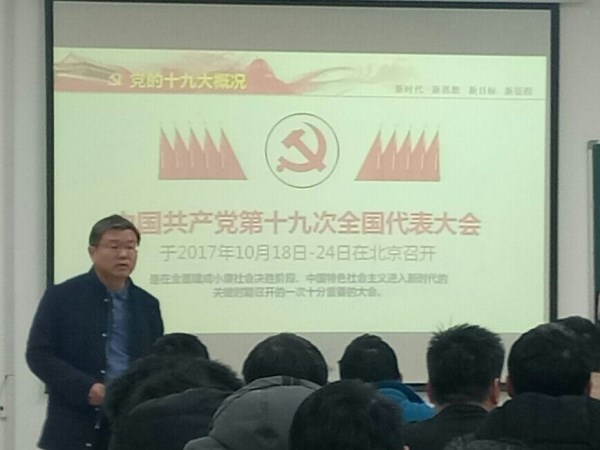 26日下午,王传礼以《新时代新思想新目标新征程——党的十九大报告内容解读》为题,为学院2016级机设专业100多名学生讲授思想政治理论课。王传礼从习近平新时代中国特色社会主义思想、中国特色社会主义进入新时代、我国社会主要矛盾的转化等方面,深入浅出地阐述了党的十九大提出的一系列新思想、新部署、新要求。王传礼强调,同学们要不忘初心,牢记使命,增强“四个意识”,坚定“四个自信”。进入新时代,站在新起点,我们要珍惜韶华,放飞梦想,在实现中国梦的奋斗中开启新征程,在为人民利益不懈奋斗中创造精彩人生、书写人生华章。
