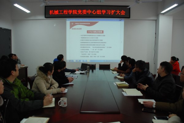 2017年12月27日,机械工程学院在学院A402召开党委理论学习中心组学习扩大会,专题学习党的十九大通过的《中国共产党章程(修正案)》。院党委委员、支部书记、师生党员代表参加会议。会议由院党委书记张安宁主持。