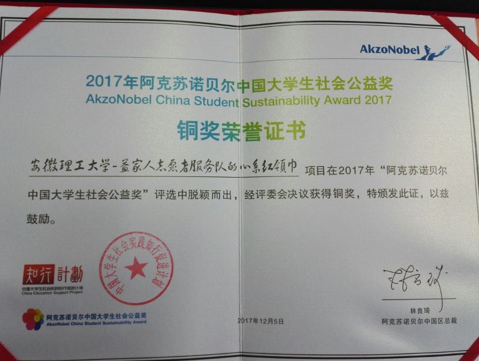 近日,2017年阿克苏诺贝尔中国大学生社会公益奖名单公布,我校经管学院益家人志愿服务队“心系红领巾”项目荣获“阿克苏诺贝尔中国大学生社会公益奖”铜奖。