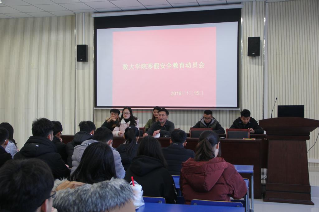 在寒假即将到来之际,为进一步增强学生安全意识,全面做好假期安全教育管理工作,数大学院于1月15日中午在学院楼一楼报告厅召开假期安全教育动员会。院党委副书记兼副院长李勇、团委老师及一百余名学生代表参加动员会。