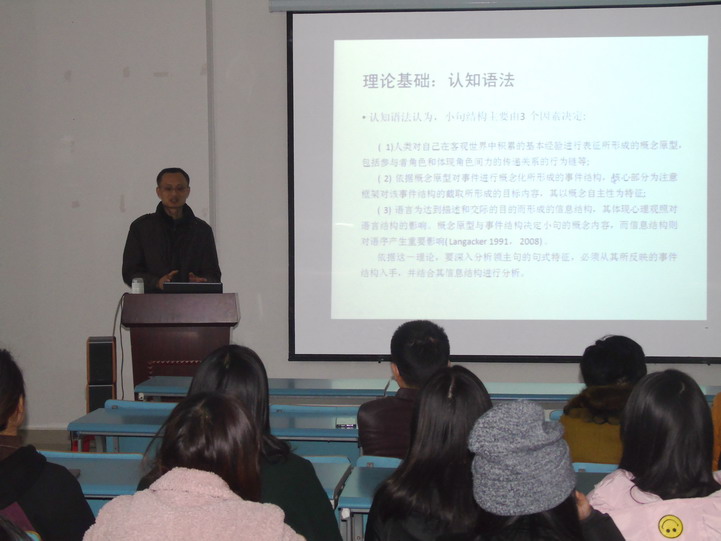 1月18日下午,应校科技产业处和外国语学院的邀请,安徽农业大学外国语学院院长孙志农教授在崇智楼B233教室作了题为《认知语法与句法分析》的学术报告。报告会由外国语学院副院长王宗华主持,学院50多位师生聆听了报告。