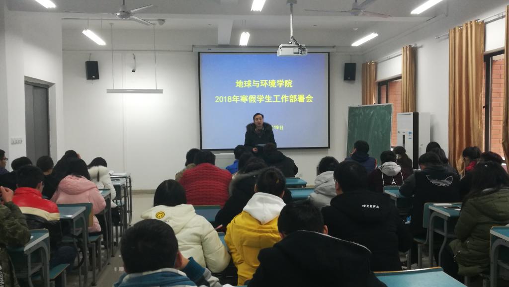 1月19日下午,地球与环境学院在静远楼202教室召开假前及寒假期间学生工作部署会。学院党委副书记侯辉,全体辅导员和各年级学生骨干60余人参加了会议。