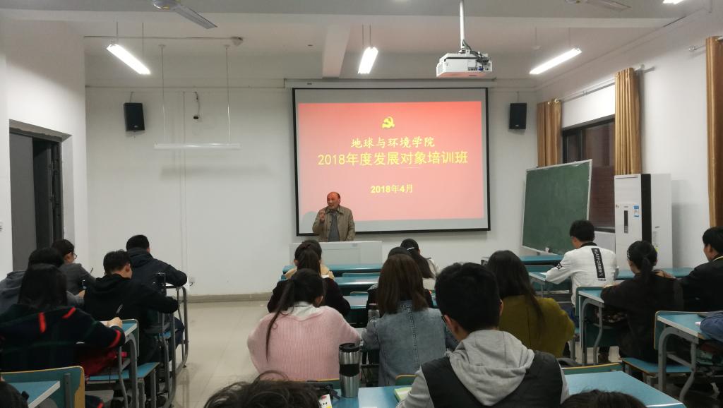 4月13日下午,地球与环境学院2018年度发展对象培训班开班仪式在静远楼202教室举行。院党委书记盛鹏飞作开班动员讲话并作专题授课。学院学生党支部书记、全体学员参加了开班仪式。